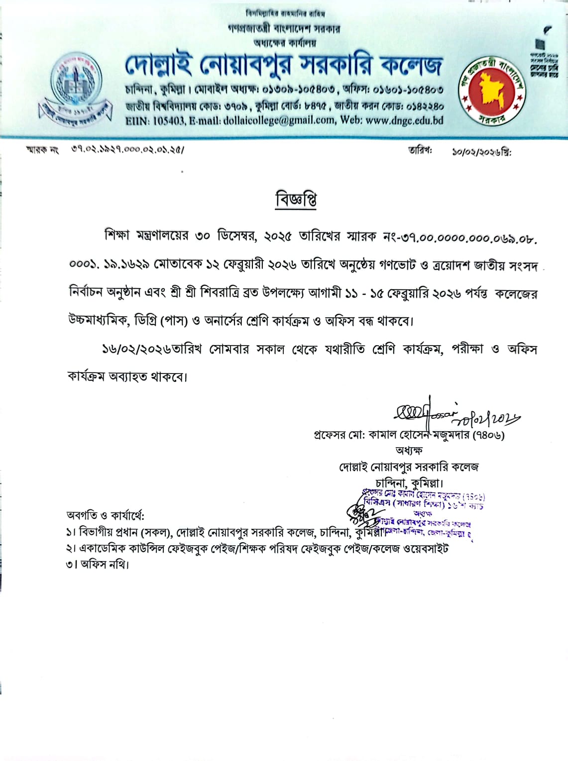 ত্রয়োদশ জাতীয় সংসদ নির্বাচন ২০২৬ এবং শ্রী শ্রী শিবরাত্রি উপলক্ষ্যে কলেজ বন্ধ থাকার বিজ্ঞপ্তি |