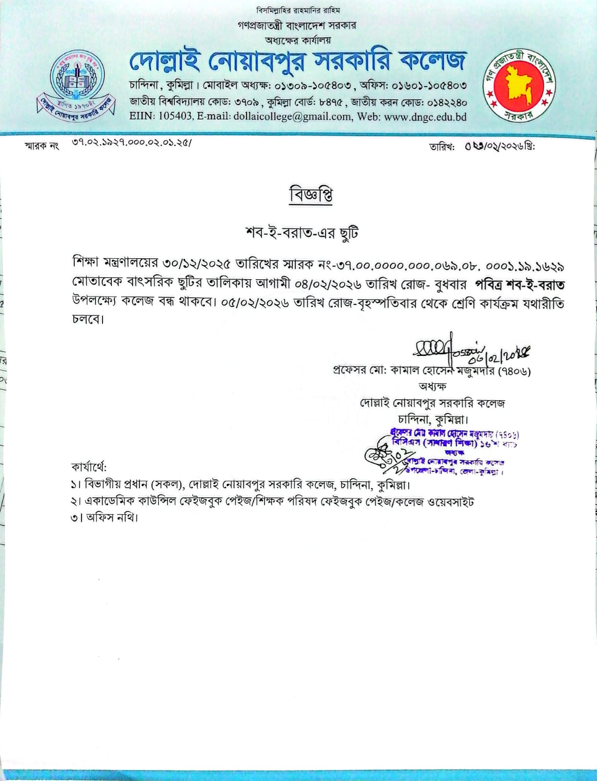 পবিত্র শব-ই-বরাত উপলক্ষে কলেজ বন্ধের বিজ্ঞপ্তি |
