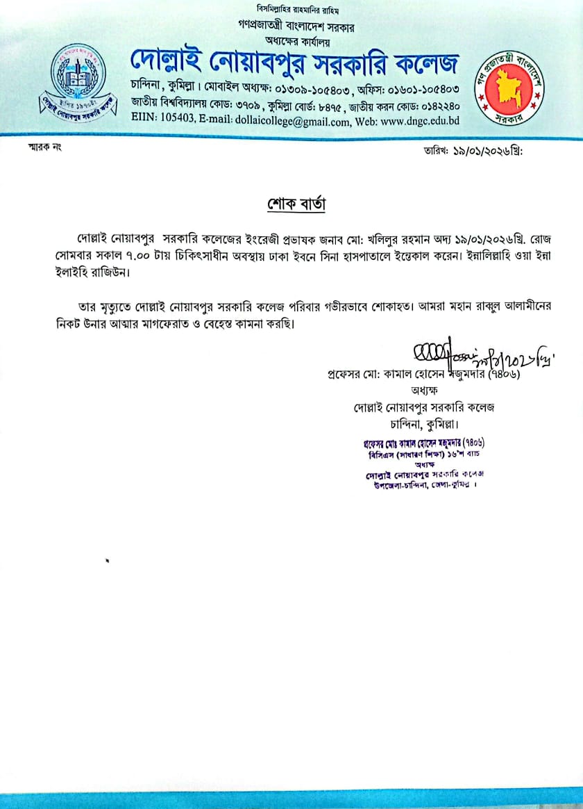 - ইংরেজী প্রভাষক জনাব মো: খলিলুর রহমান এর মৃত্যুতে শোকবার্তা